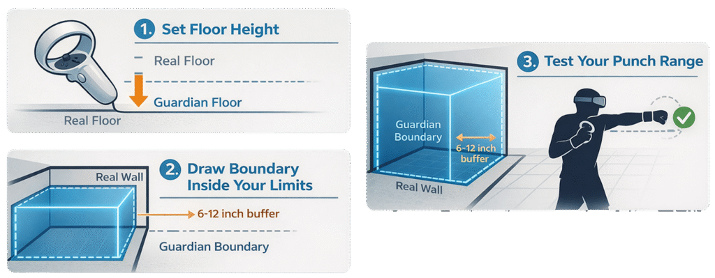 Here’s the best-practice Guardian setup. Put on your headset and go to Settings, then Guardian. Set your floor height by touching the controller to the ground. Draw your boundary about 6 to 12 inches inside your real limits—this is critical. Stand in the center and recenter your view. Finally, extend your arms at punch height, not resting at your sides.